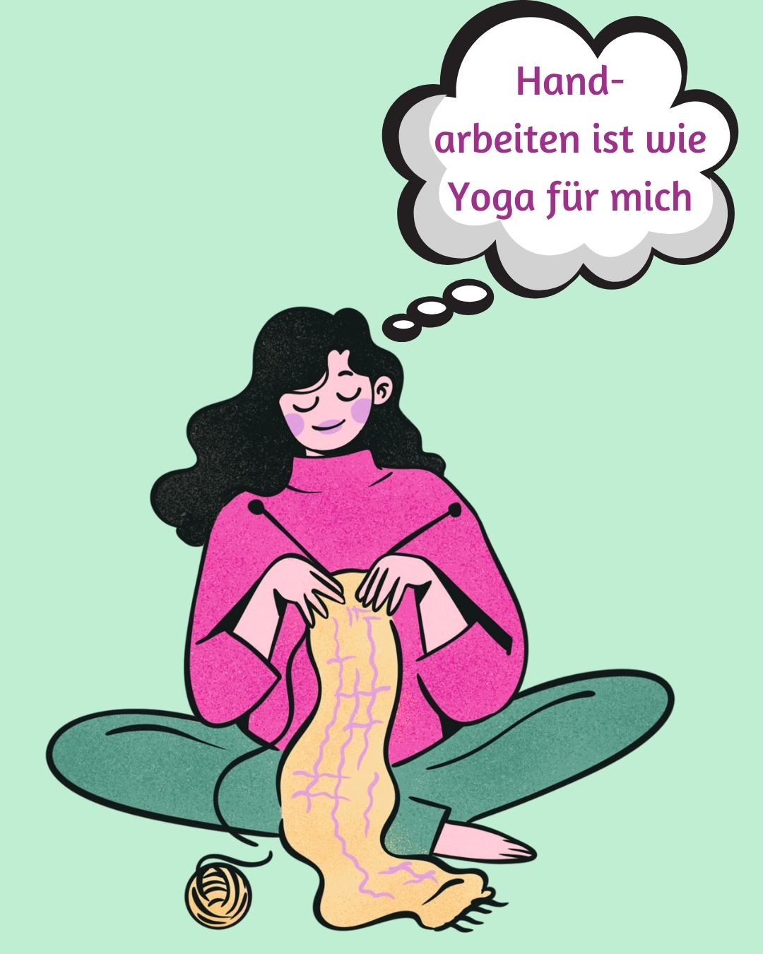 Zusätzlich bekommst Du von mir Wellness in Form psychologischer Impulse für Entspannung (Fantasiereisen, Achtsamkeitsübungen), während derer Du einfach weiter handarbeiten kannst.